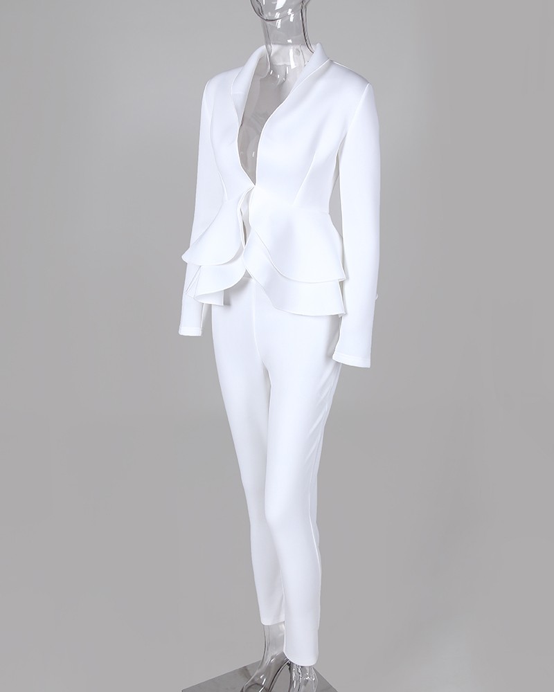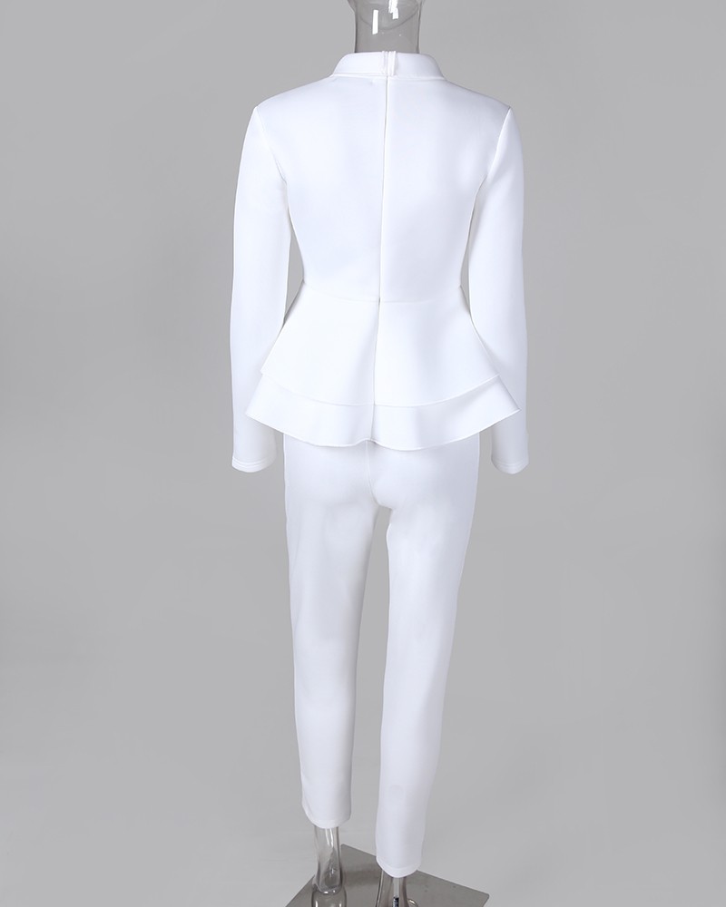 Solid Color White Flounced Long Sleeve Two-Piece Set