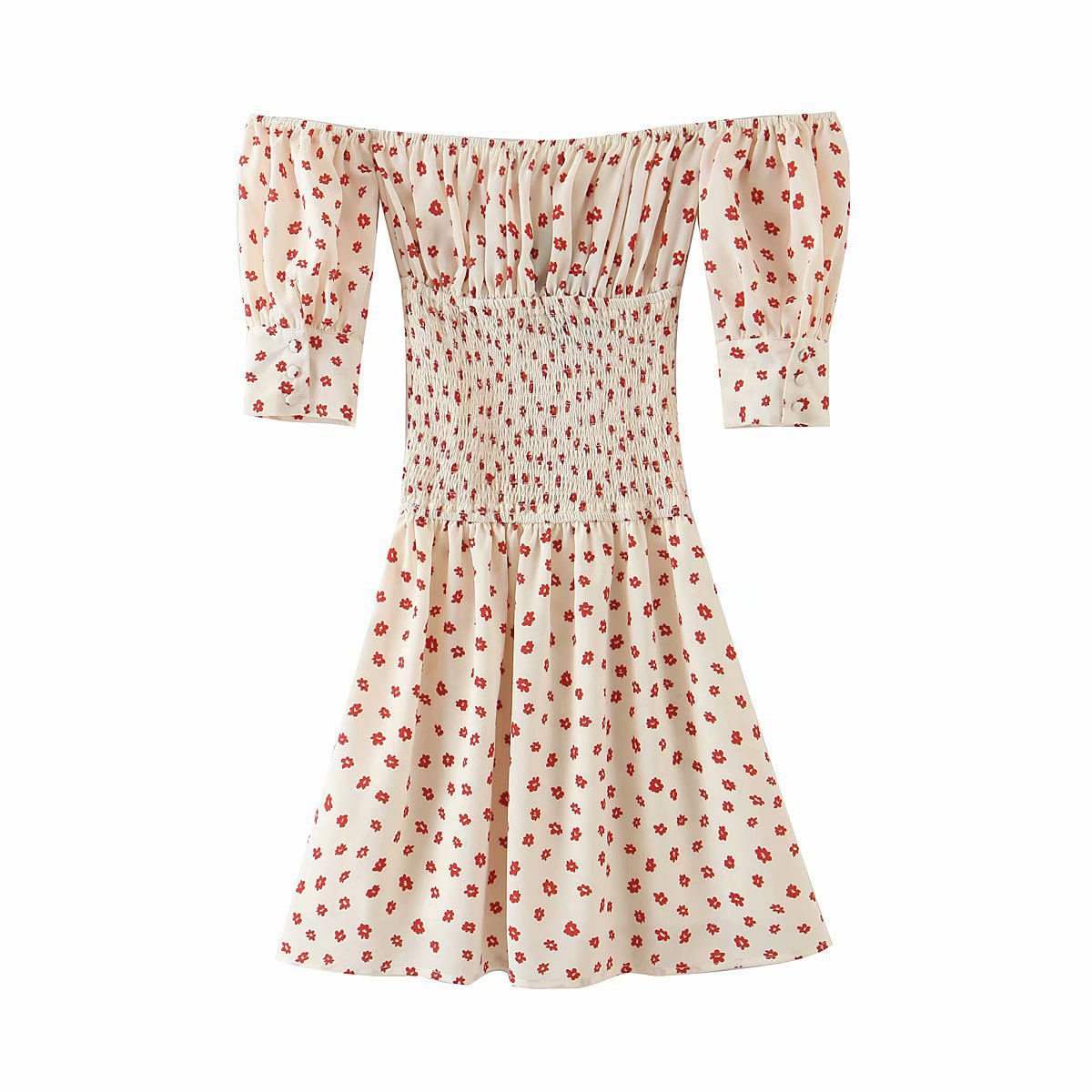 Women'S Retro Printing One Word Collar Short Sleeve Dress