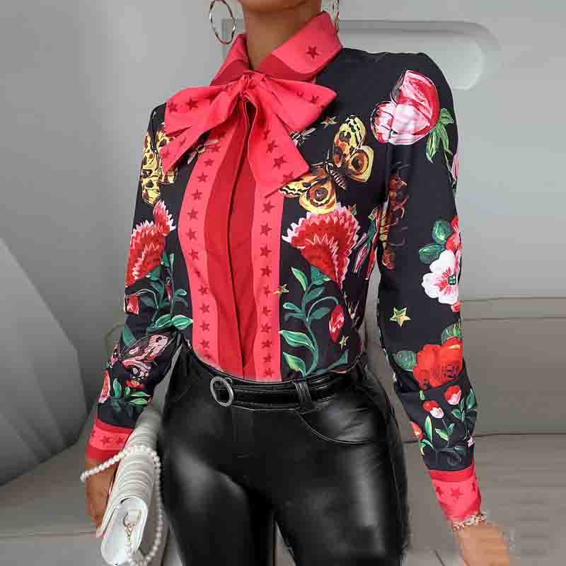 Butterfly Print Star Red-Trimmed Lapel Long-Sleeved Shirt