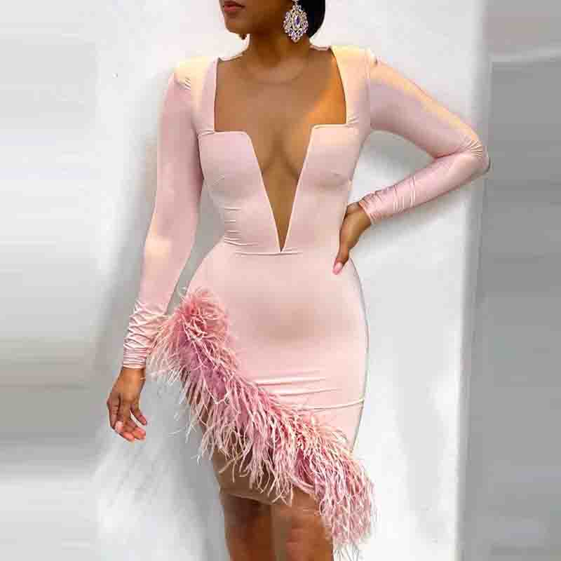Pink Solid Color V-Neck Long Sleeve Dress