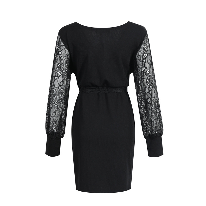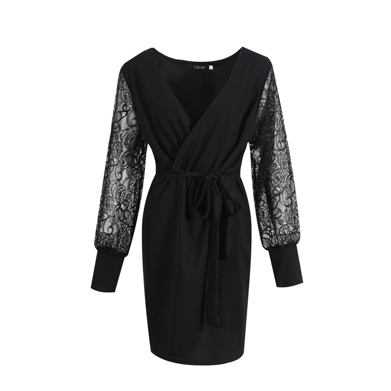 Solid Color V-Neck Lace Long-Sleeved Sexy Dress