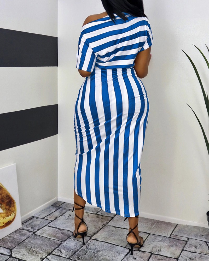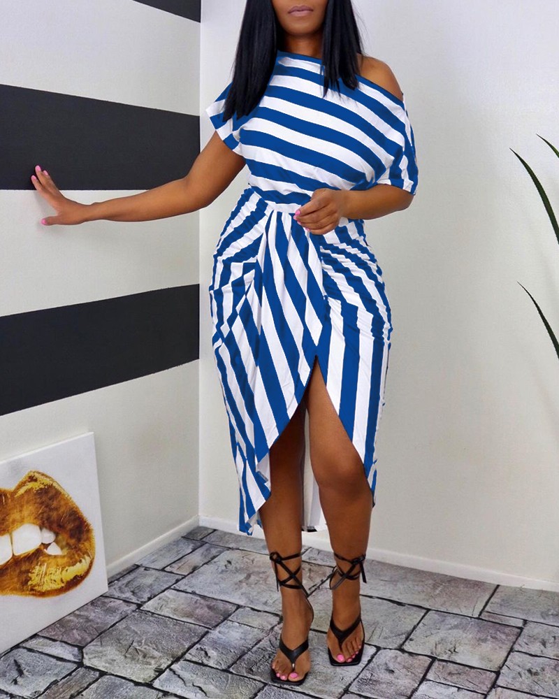 Sexy Women's Off Shoulder Bat Sleeve Striped Split Dress