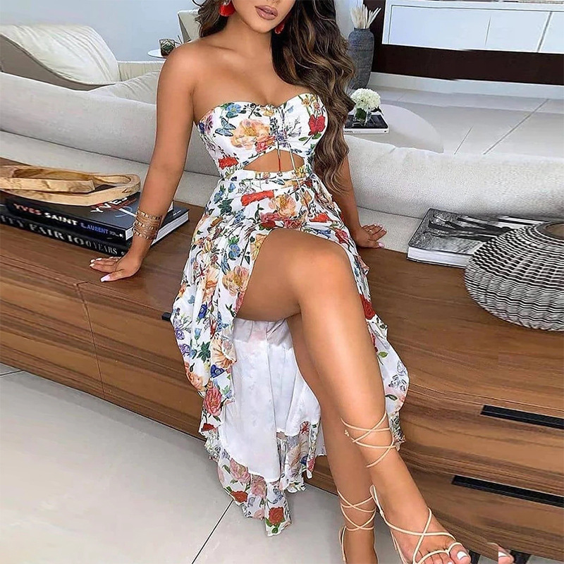 Women'S Printed Wrapped Chest Split Sexy Irregular Dress