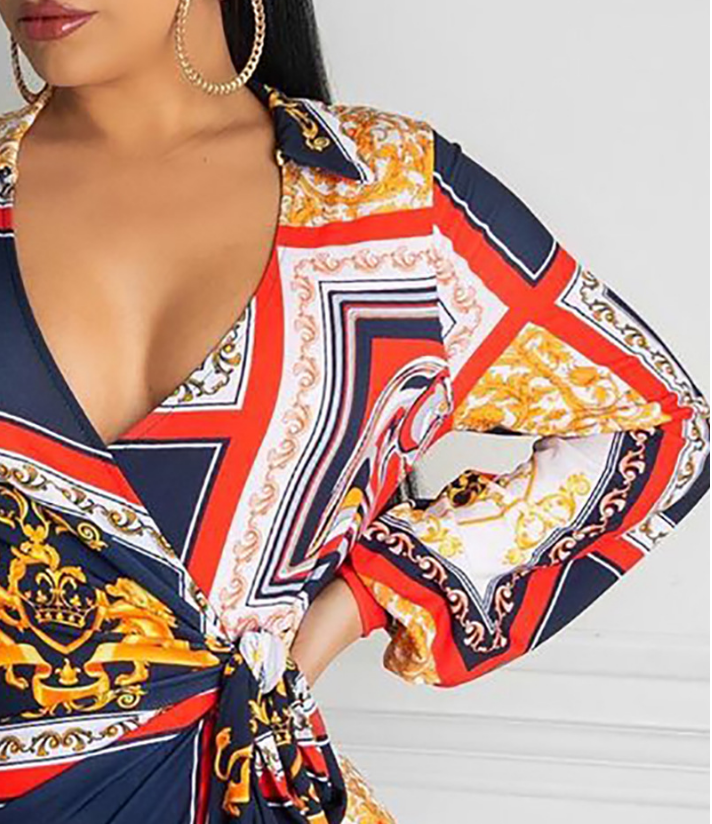 Sexy Printed Long Sleeve Deep V-Neck High Waist Dress