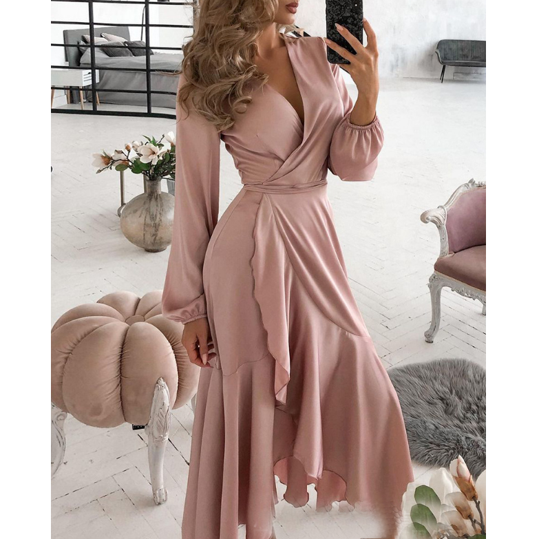 V-Neck Sexy Pink Ruffled Long Sleeve Dress