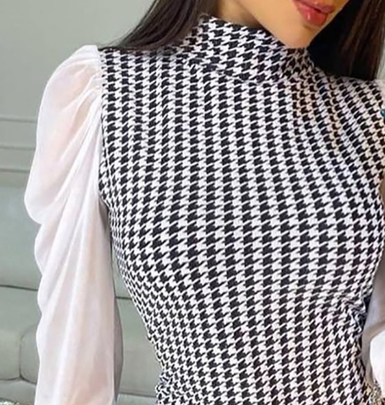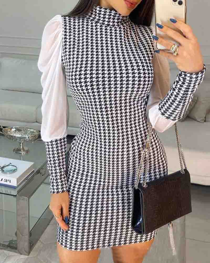 Women'S Bird Check Long-Sleeved Tight-Fitting Hip Dress