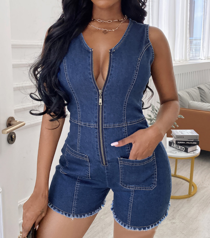 Solid Color V-Neck Zipper Denim Jumpsuit