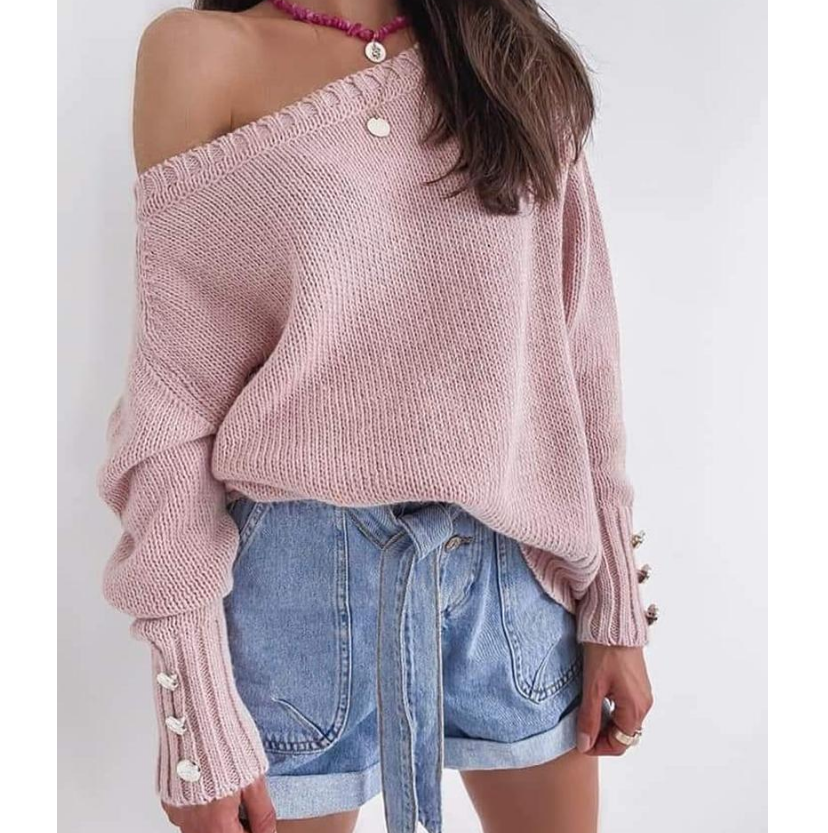 Long Sleeve Women'S Pink Casual Off-The-Shoulder Sweater