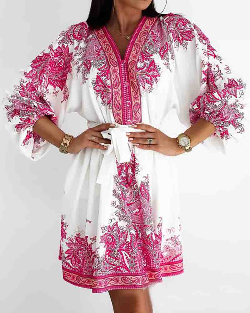 Floral Rose Red V-Neck Long-Sleeved Printed Dress