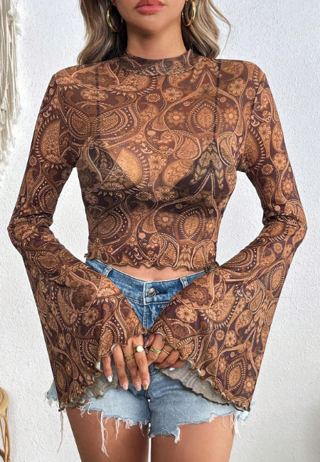 Women'S Mesh Printed Round Neck Flared Sleeve Long Sleeved T-Shirt