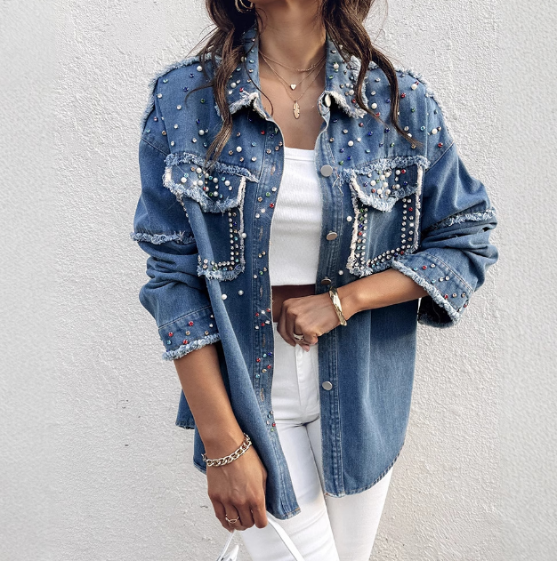Women Nail Bead Contrasting Denim Long Sleeved Jacket